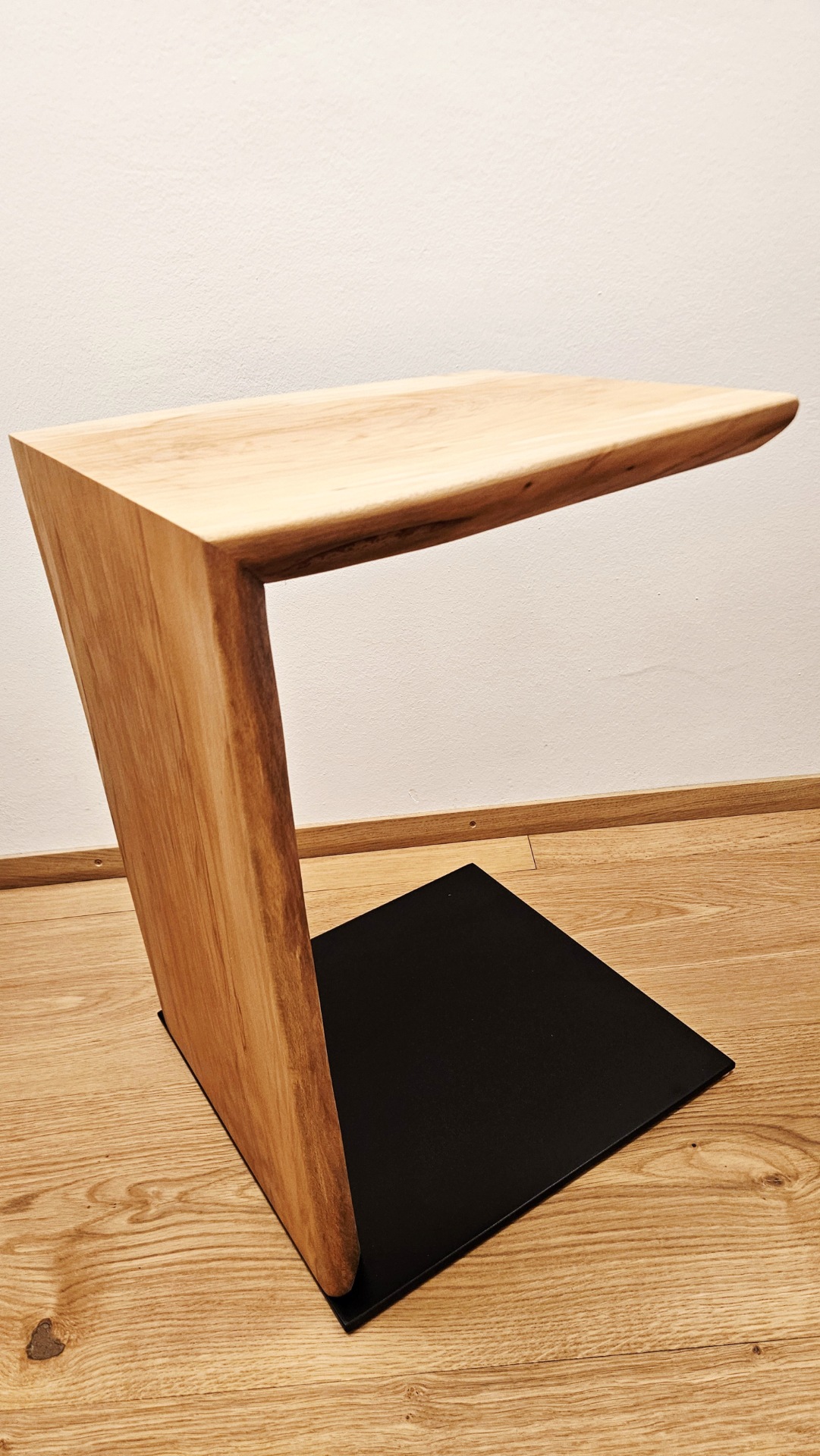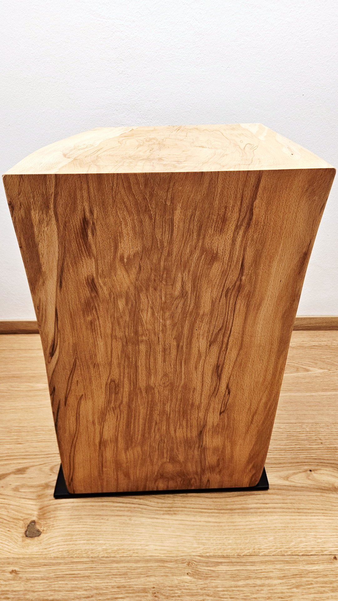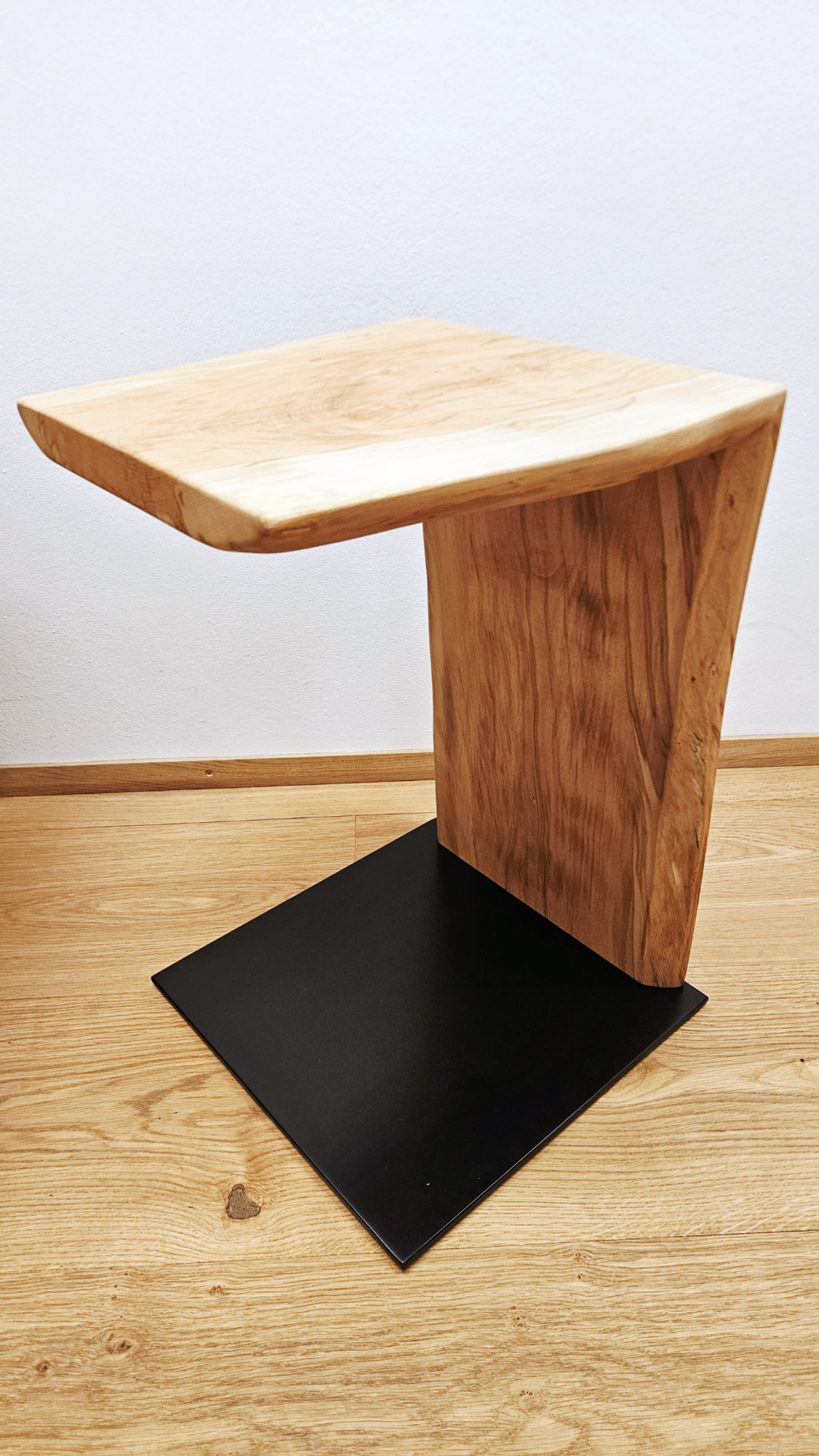 Der stabile Stahlsockel ist schwarz matt pulverbeschichtet und bildet einen klaren Kontrast zum warmen Holz. Die schlichte Form sorgt für einen zeitlosen Look und hohe Standfestigkeit.