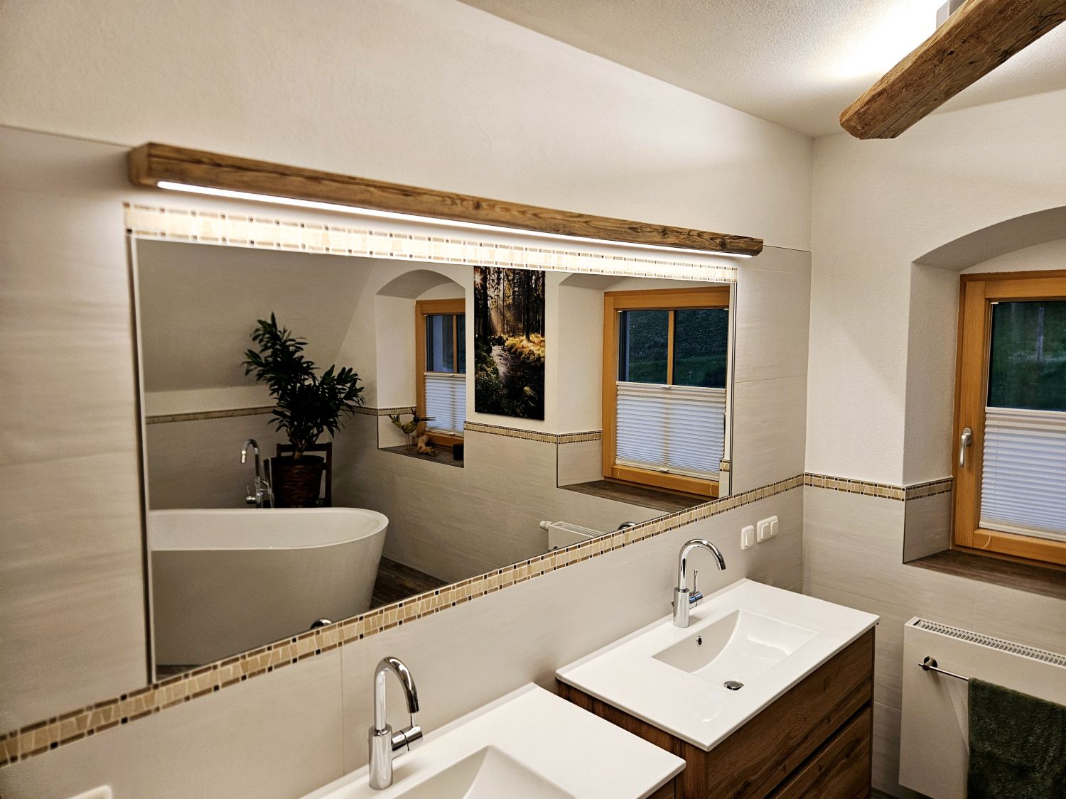 Die integrierten, energieeffizienten LED-Streifen sorgen für ein angenehmes, warmweißes Licht. Dank der dimmbaren Ausführung können Sie die Helligkeit individuell anpassen – perfekt für stimmungsvolles Licht im Wohnraum, Badezimmer oder Eingangsbereich.
