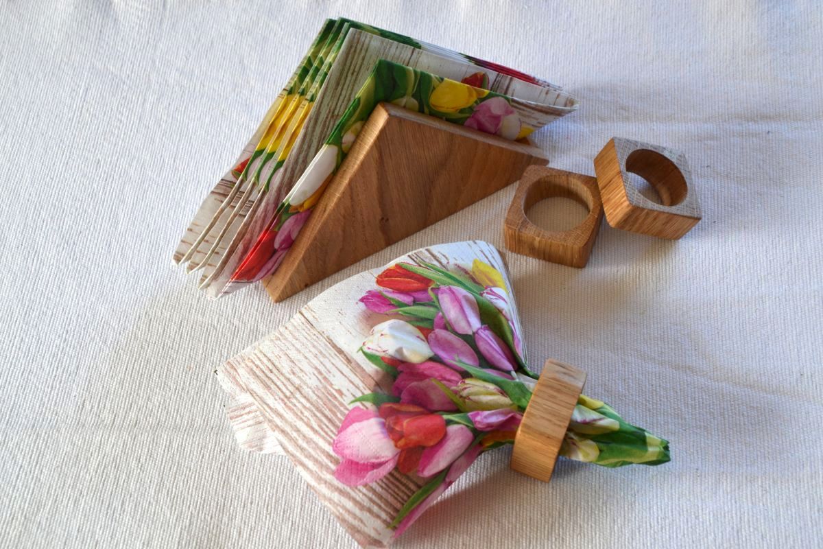 Schlicht, elegant und handgefertigt – diese Serviettenringe und der passende Serviettenhalter aus massiver Eiche bringen natürliche Wärme und stilvolle Ordnung auf jeden Esstisch.