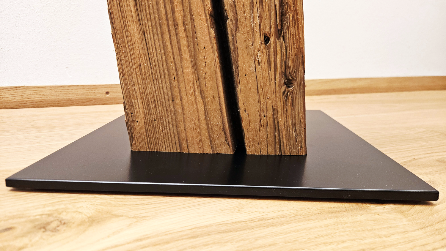 Die massiven Altholzbalken sorgen für Stabilität und Langlebigkeit. Naturbelassen kommen die einzigartige handgehackte Maserung und Farbnuancen besonders schön zur Geltung.